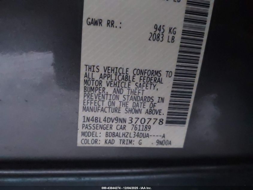 Цвет СерыйЦилиндры 4Привод Передний приводVIN 1N4BL4DV9NN370778Состояние Заводится и едет (проверено)Повреждения Передняя или задняя AutoRIA