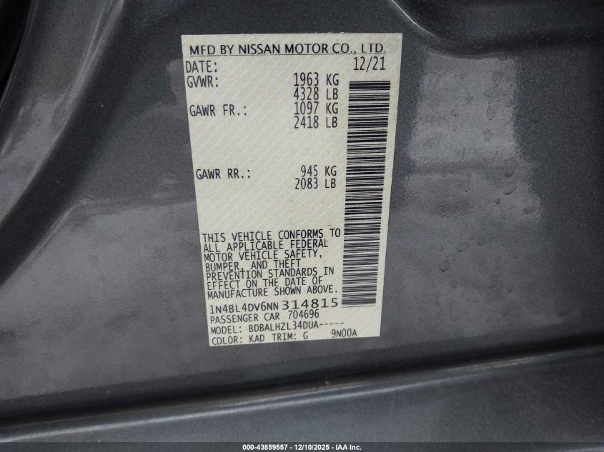 2022 NISSAN ALTIMA 2022 року Бензин, 2.5, Передний привод, vin - 1N4BL4DV6NN314815 из США