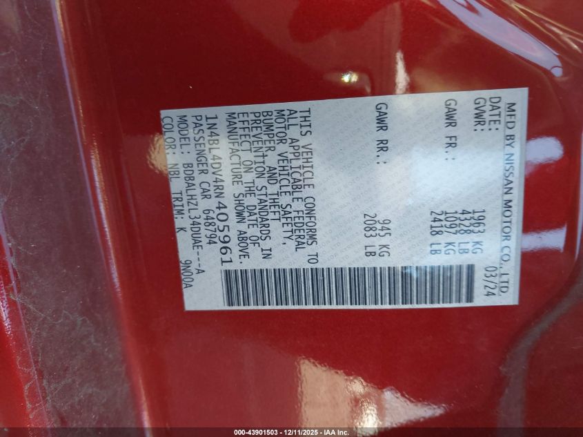 2024 NISSAN ALTIMA 2024 року Бензин, 2.5, Передний привод, vin - 1N4BL4DV4RN405961 из США