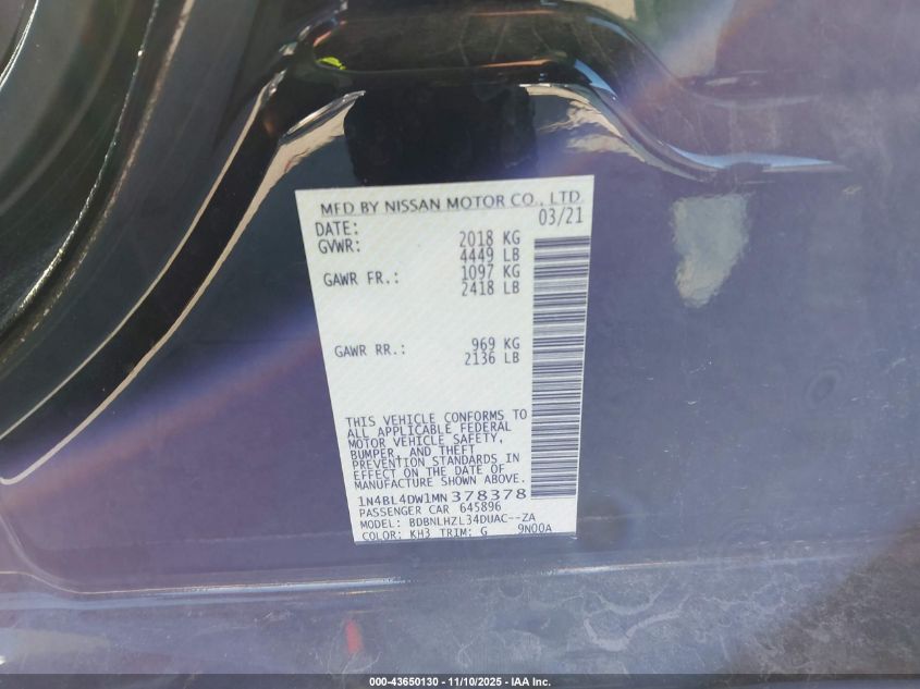 2021 NISSAN ALTIMA 2021 року Бензин, 2.5, Полный привод, vin - 1N4BL4DW1MN378378 из США