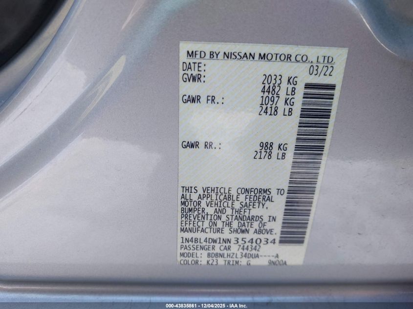 2022 NISSAN ALTIMA 2022 року Бензин, 2.5, Полный привод, vin - 1N4BL4DW1NN354034 из США
