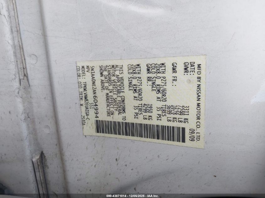 Цвет БелыйЦилиндры 8Привод Полный приводVIN 5N1AA0NE2AN604994Состояние Заводится и едет (проверено)Повреждения Передняя или задняя