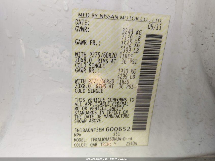 2014 NISSAN ARMADA 2014 року Бензин, 5.6, , vin - 5N1BA0NF5EN600652 из США