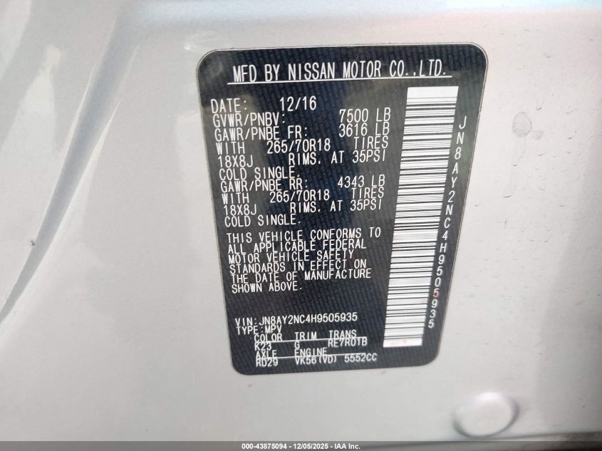 2017 NISSAN ARMADA 2017 року Бензин, 5.6, Полный привод, vin - JN8AY2NC4H9505935 из США