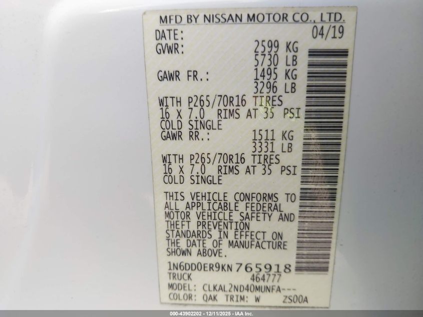 2019 NISSAN FRONTIER 2019 року Бензин, 4.0, , vin - 1N6DD0ER9KN765918 из США