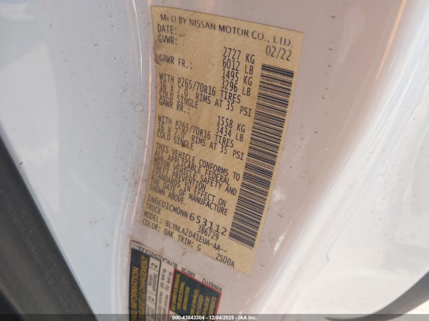 Цвет БелыйЦилиндры 6Привод Полный приводVIN 1N6ED1CM0NN653112Состояние Заводится и едет (проверено)Повреждения Передняя или задняя AutoRIA