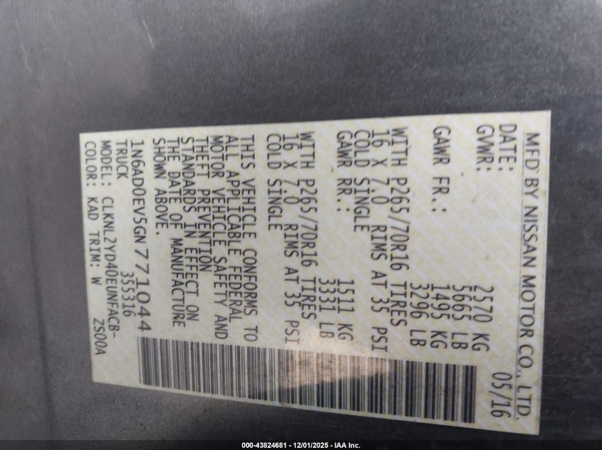 2016 NISSAN FRONTIER 2016 року Бензин, 4.0, Полный привод, vin - 1N6AD0EV5GN771044 из США