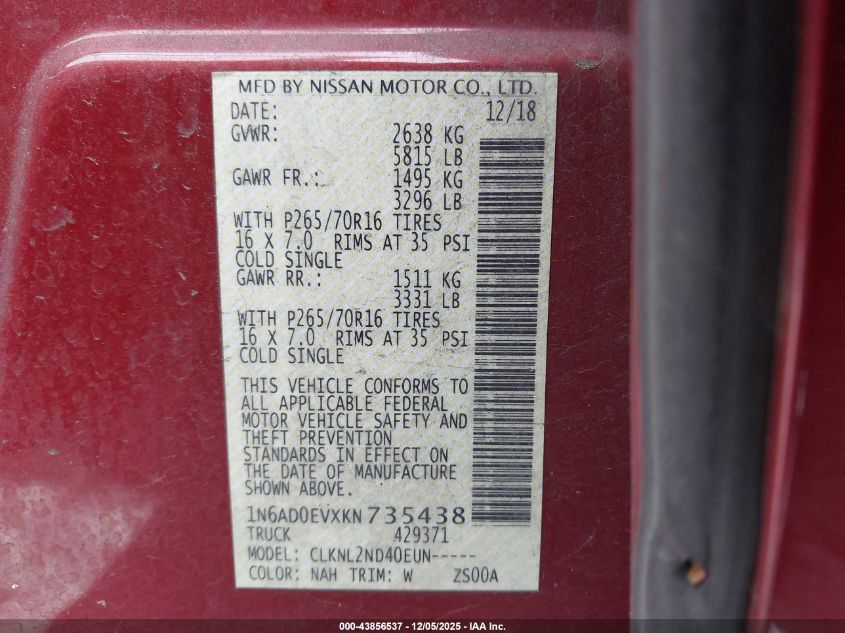 2019 NISSAN FRONTIER 2019 року Бензин, 4.0, Полный привод, vin - 1N6AD0EVXKN735438 из США