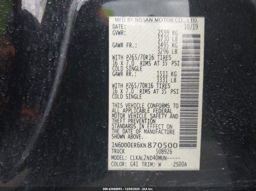 2019 NISSAN FRONTIER 2019 року Бензин, 4.0, , vin - 1N6DD0ER6KN870500 из США