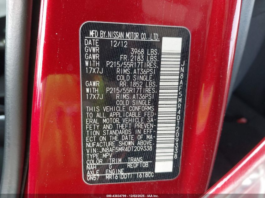 Цвет КрасныйЦилиндры 4Привод Передний приводVIN JN8AF5MR4DT209338Состояние Заводится и едет (проверено)Повреждения Левая сторона AutoRIA