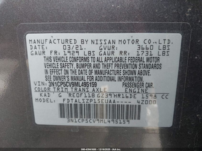 2021 NISSAN KICKS 2021 року Бензин, 1.6, Передний привод, vin - 3N1CP5CV9ML495159 из США