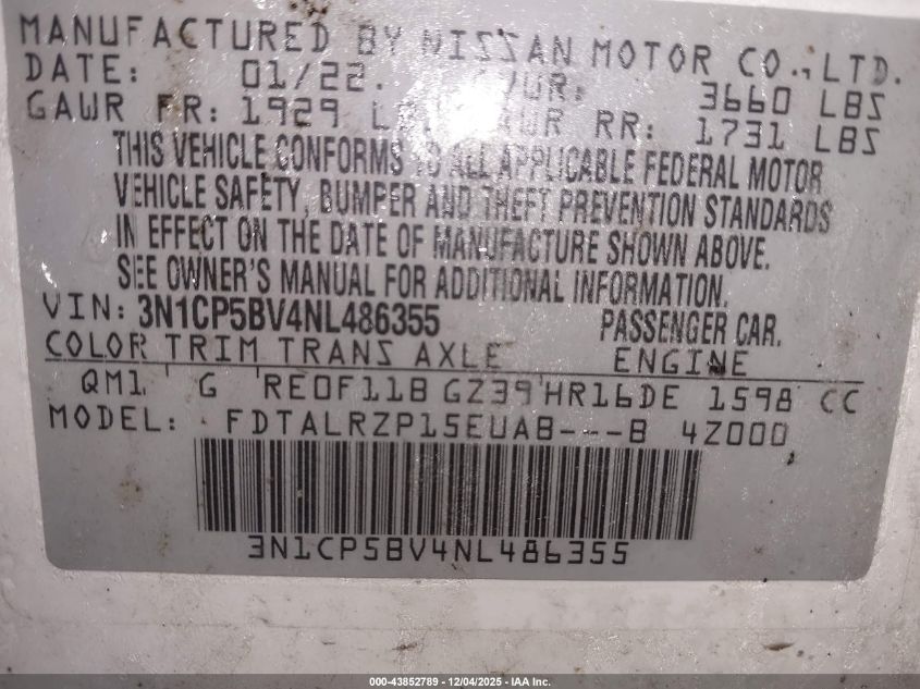 2022 NISSAN KICKS 2022 року Бензин, 1.6, Передний привод, vin - 3N1CP5BV4NL486355 из США