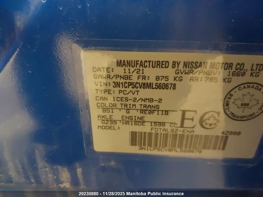 Цвет СинийЦилиндры 4Привод Передний приводVIN 3N1CP5CV8ML560678Состояние СтационарноПовреждения Правая сторонаДата аукциона 2025-12-10 AutoRIA