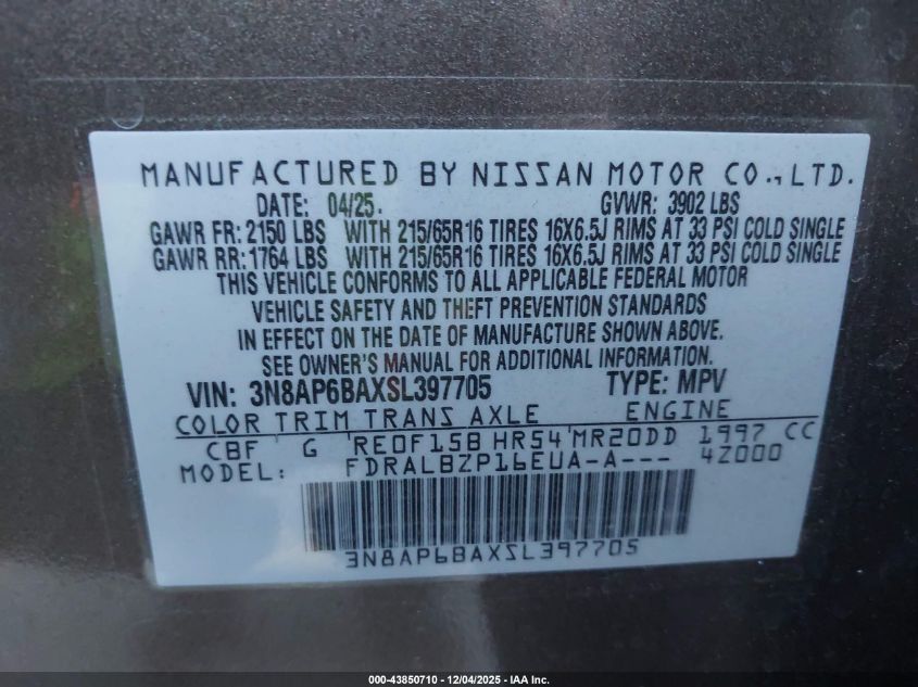 2025 NISSAN KICKS 2025 року Бензин, 2.0, Передний привод, vin - 3N8AP6BAXSL397705 из США