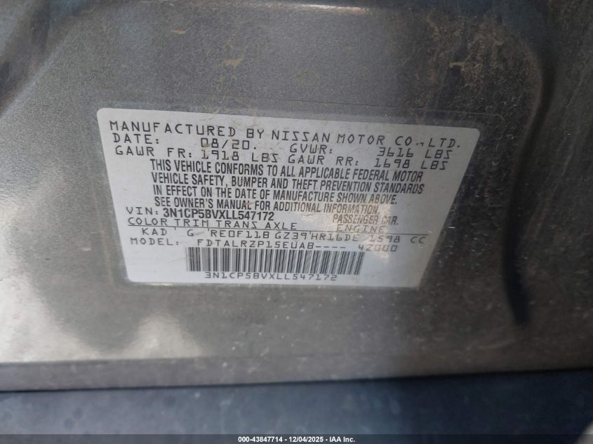 2020 NISSAN KICKS 2020 року Бензин, 1.6, Передний привод, vin - 3N1CP5BVXLL547172 из США