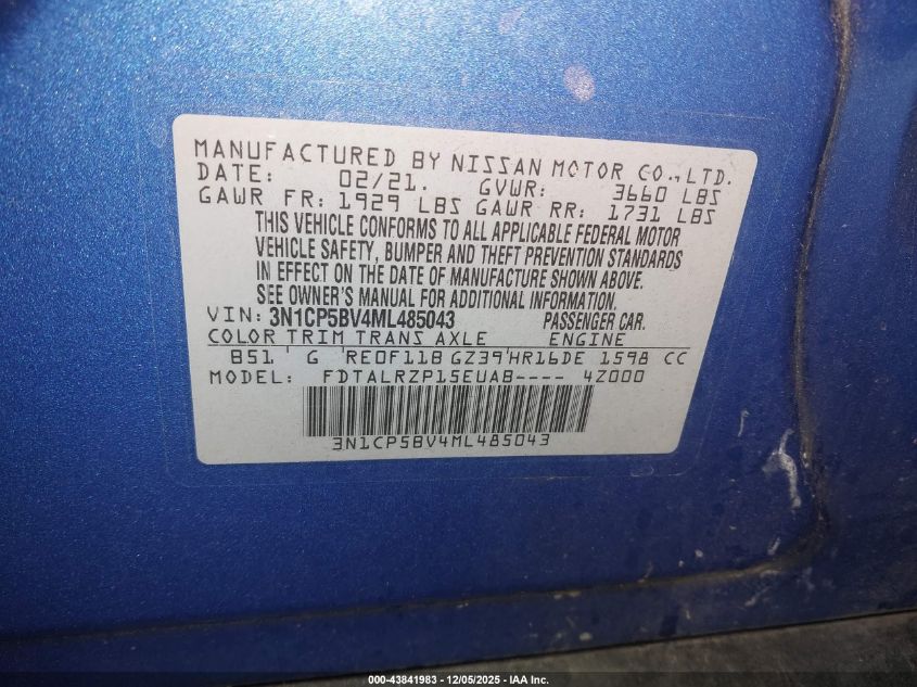 2021 NISSAN KICKS 2021 року Бензин, 1.6, Передний привод, vin - 3N1CP5BV4ML485043 из США