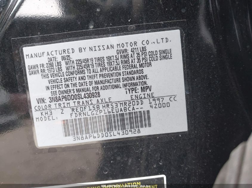 2025 NISSAN KICKS 2025 року Бензин, 2.0, Полный привод, vin - 3N8AP6DD0SL430928 из США