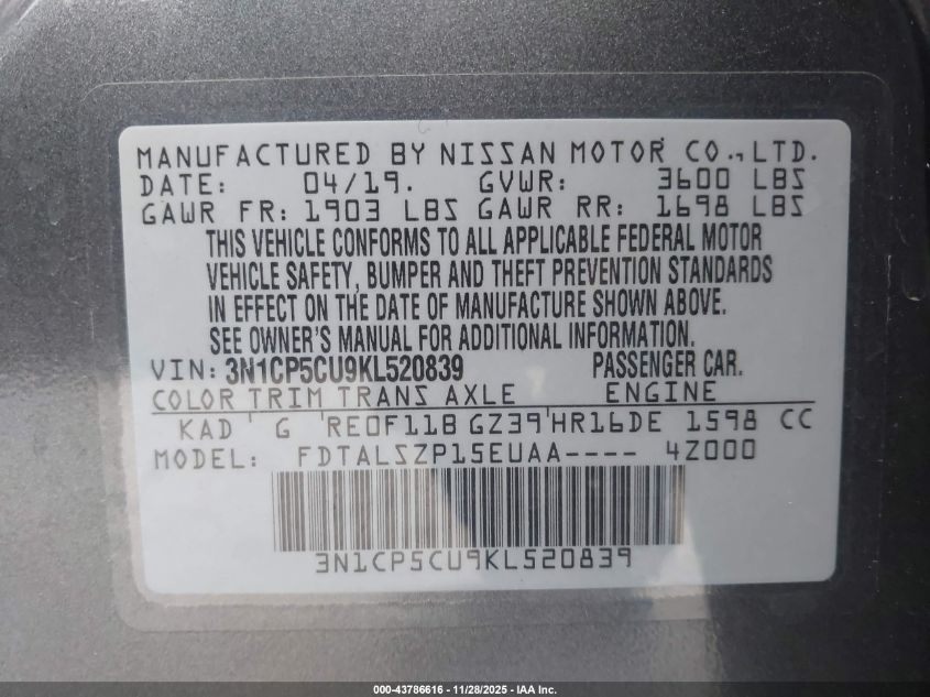 2019 NISSAN KICKS 2019 року Бензин, 1.6, Передний привод, vin - 3N1CP5CU9KL520839 из США