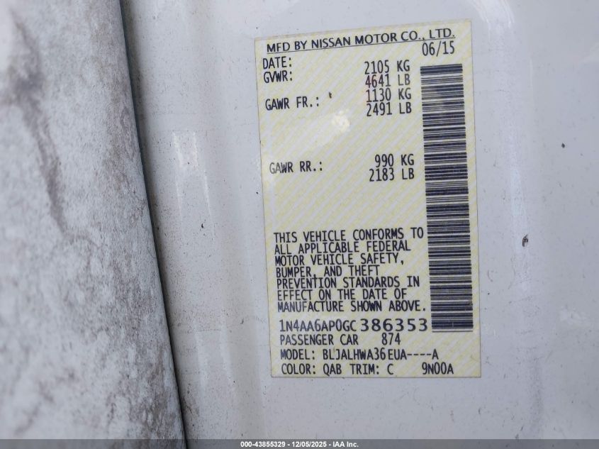Цвет БелыйЦилиндры 6Привод Передний приводVIN 1N4AA6AP0GC386353Состояние СтационарноПовреждения Передняя или задняя AutoRIA