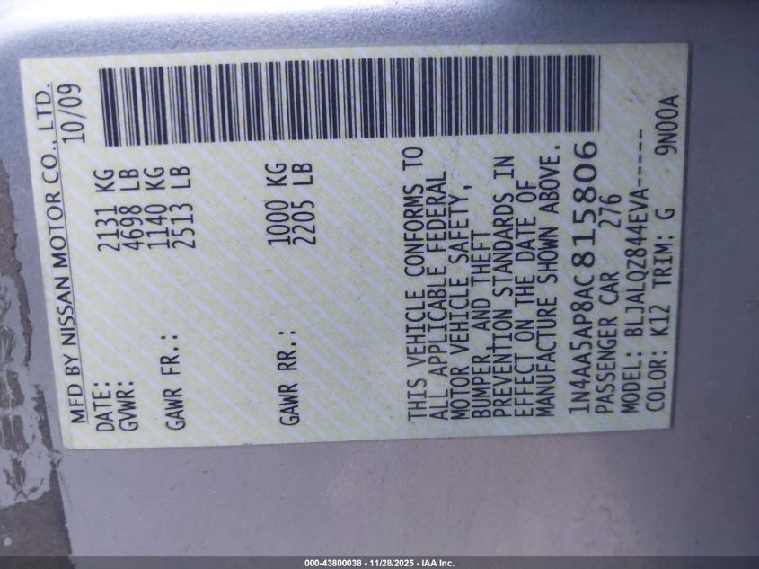 2010 NISSAN MAXIMA 2010 року Бензин, 3.5, Передний привод, vin - 1N4AA5AP8AC815806 из США