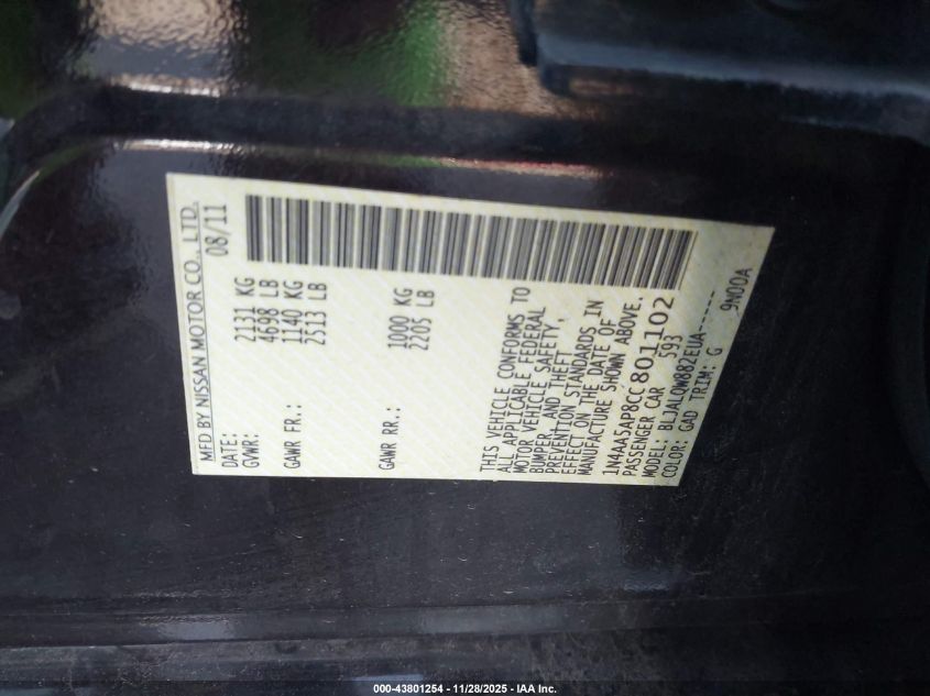 2012 NISSAN MAXIMA 2012 року Бензин, 3.5, Передний привод, vin - 1N4AA5AP8CC801102 из США