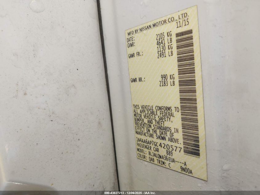 Цвет БелыйЦилиндры 6Привод Передний приводVIN 1N4AA6AP7GC420577Состояние СтационарноПовреждения По бокам AutoRIA