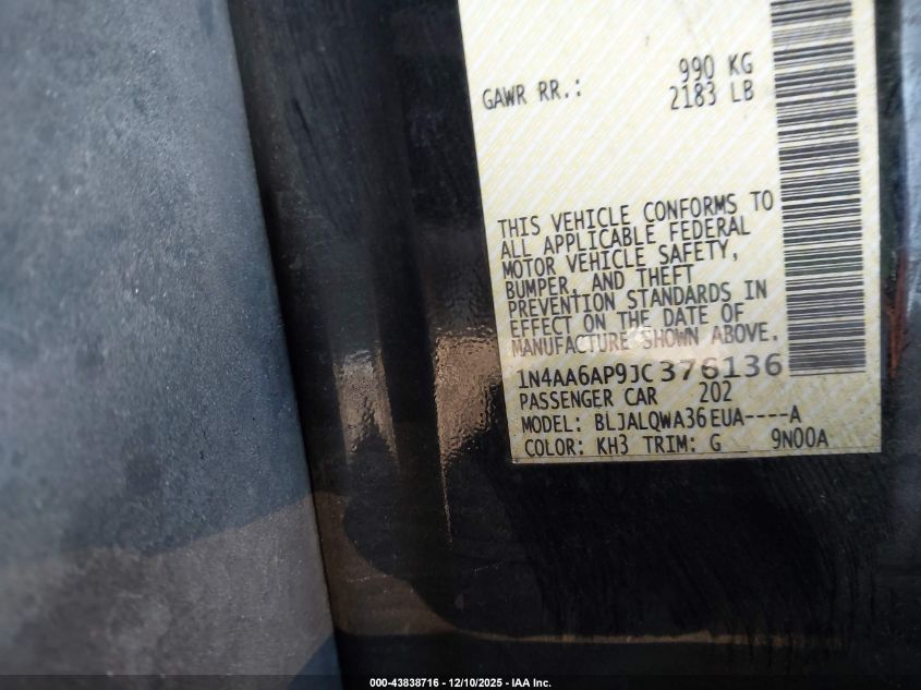 Цвет ЧерныйЦилиндры 6Привод Передний приводVIN 1N4AA6AP9JC376136Состояние Заводится и едет (проверено)Повреждения Передняя или задняя AutoRIA
