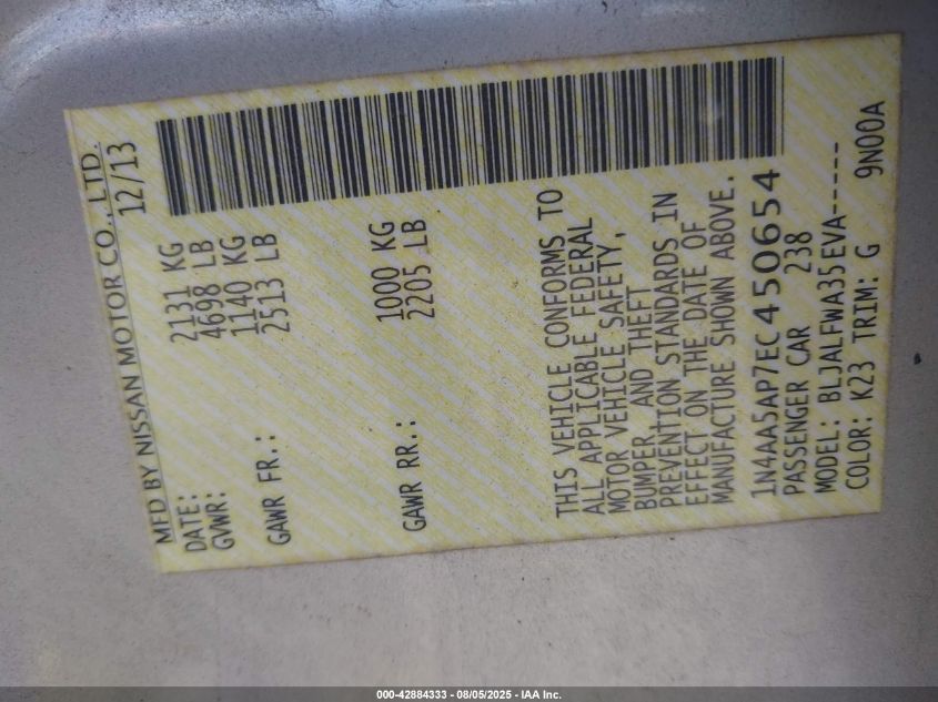2014 NISSAN MAXIMA 2014 року Бензин, 3.5, Передний привод, vin - 1N4AA5AP7EC450654 из США