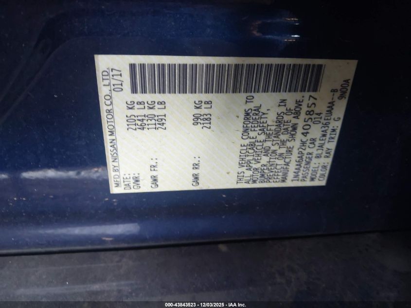 Цвет СинийЦилиндры 6Привод Передний приводVIN 1N4AA6AP2HC405857Состояние СтационарноПовреждения По бокам AutoRIA