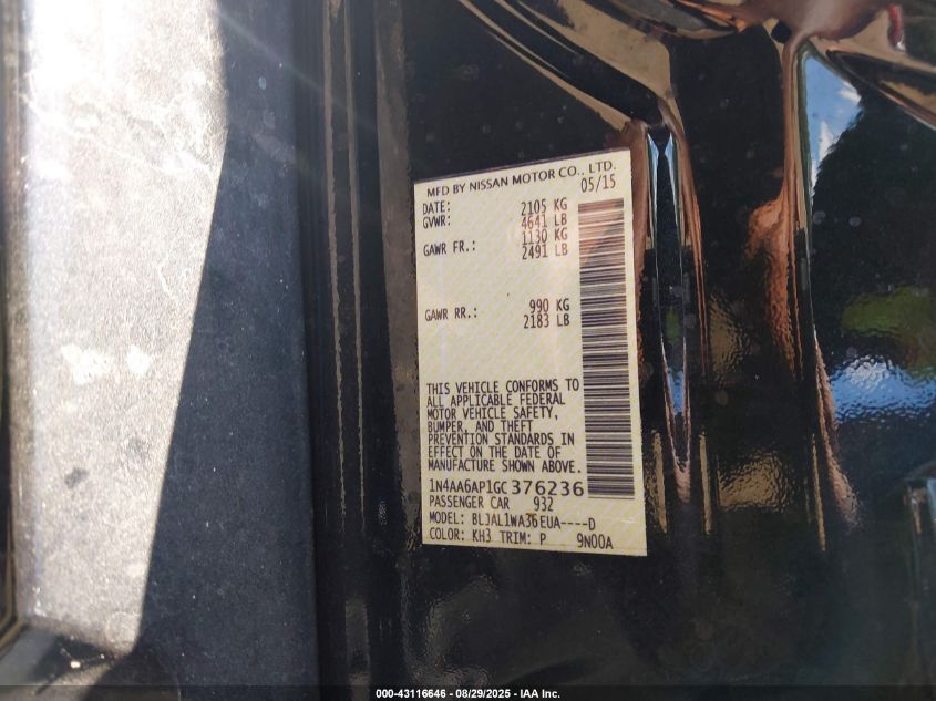 Цвет ЧерныйЦилиндры 6Привод Передний приводVIN 1N4AA6AP1GC376236Состояние СтационарноПовреждения Левая сторона AutoRIA