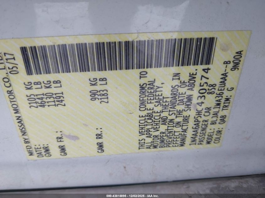 2017 NISSAN MAXIMA 2017 року Бензин, 3.5, Передний привод, vin - 1N4AA6AP5HC430574 из США