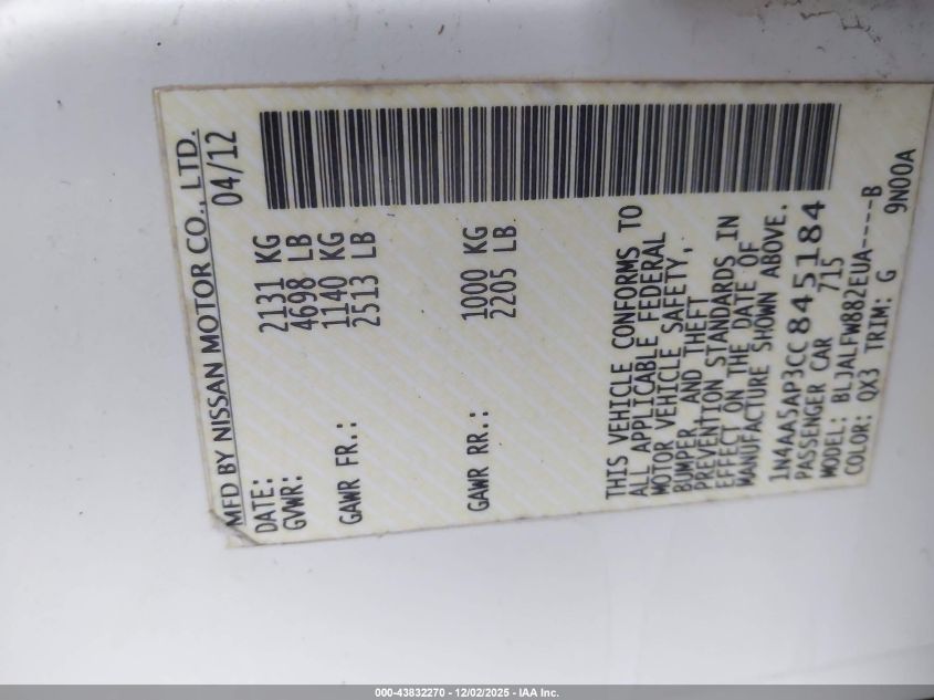 Цвет БелыйЦилиндры 6Привод Передний приводVIN 1N4AA5AP3CC845184Состояние СтационарноПовреждения Передняя или задняя