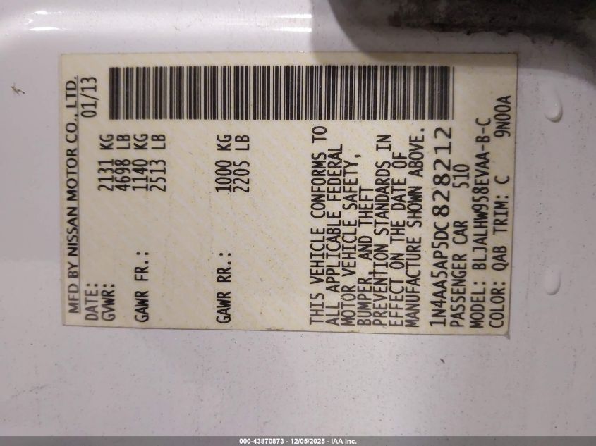 Цвет БелыйЦилиндры 6Привод Передний приводVIN 1N4AA5AP5DC828212Состояние СтационарноПовреждения Правая сторона AutoRIA