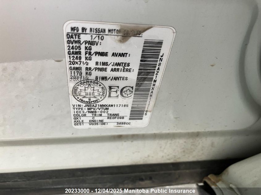 Цвет БелыйЦилиндры 6Привод Полный приводVIN JN8AZ1MWXAW117165Состояние СтационарноПовреждения По всему автоДата аукциона 2025-12-10 AutoRIA