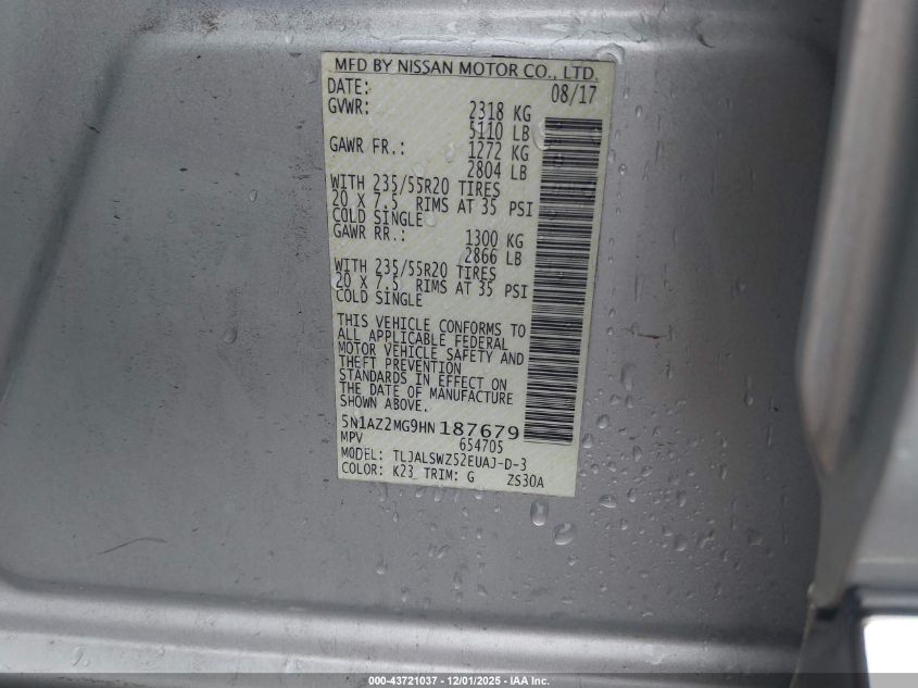2017 NISSAN MURANO 2017 року Бензин, 3.5, Передний привод, vin - 5N1AZ2MG9HN187679 из США