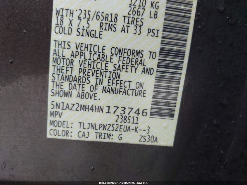 Цвет СерыйЦилиндры 6Привод Полный приводVIN 5N1AZ2MH4HN173746Состояние Заводится и едет (проверено)Повреждения Передняя или задняя AutoRIA