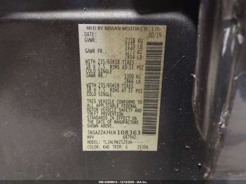 2020 NISSAN MURANO 2020 року Бензин, 3.5, Передний привод, vin - 5N1AZ2AJ4LN108363 из США