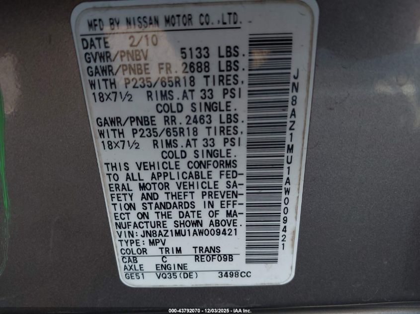2010 NISSAN MURANO 2010 року Бензин, 3.5, Передний привод, vin - JN8AZ1MU1AW009421 из США