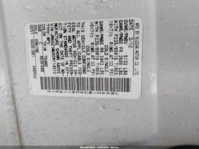 2012 NISSAN MURANO 2012 року Бензин, 3.5, Передний привод, vin - JN8AZ1MU6CW114510 из США