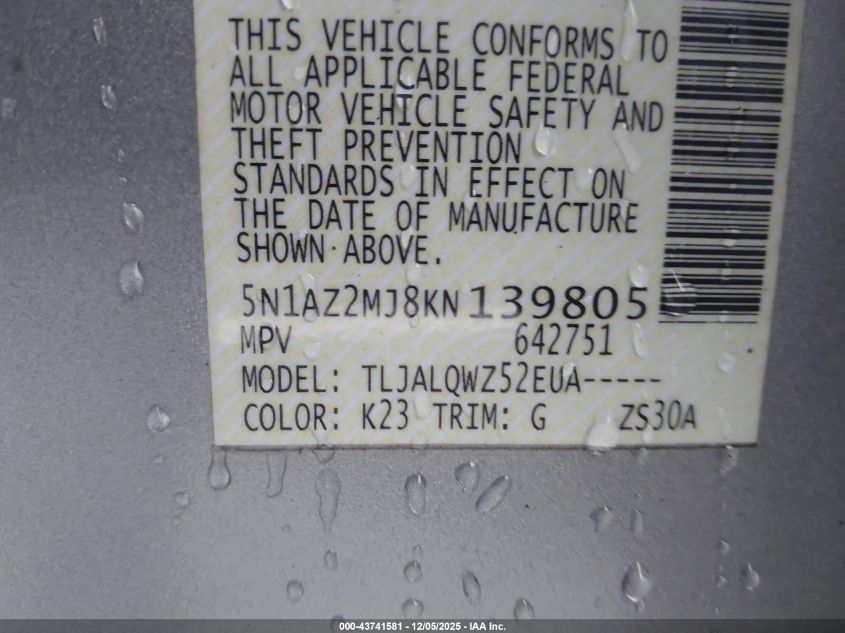 Цвет СеребряныйЦилиндры 6Привод Передний приводVIN 5N1AZ2MJ8KN139805Состояние Заводится и едет (проверено)Повреждения Передняя или задняя AutoRIA
