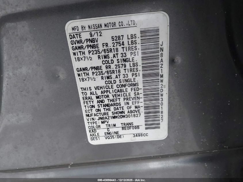 Цвет СерыйЦилиндры 6Привод Полный приводVIN JN8AZ1MW2DW301827Состояние Заводится и едет (проверено)Повреждения Левая сторона AutoRIA