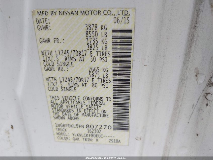 2015 NISSAN NV CARGO 2015 року Бензин, 4.0, Задний привод, vin - 1N6BF0KL9FN807270 из США