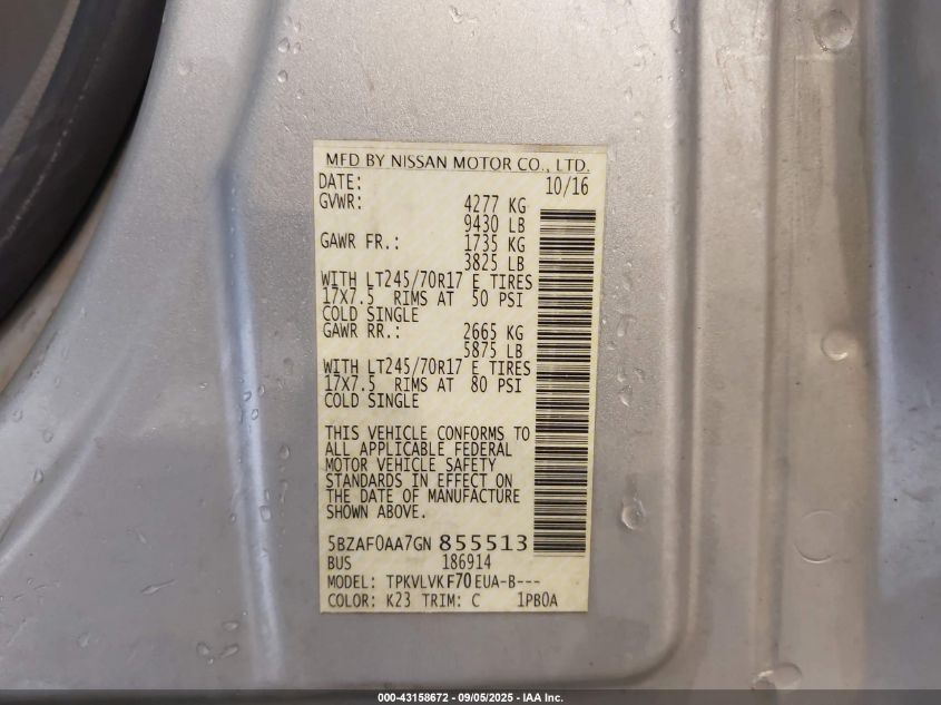 2016 NISSAN NV3500 2016 року Бензин, 5.6, Задний привод, vin - 5BZAF0AA7GN855513 из США