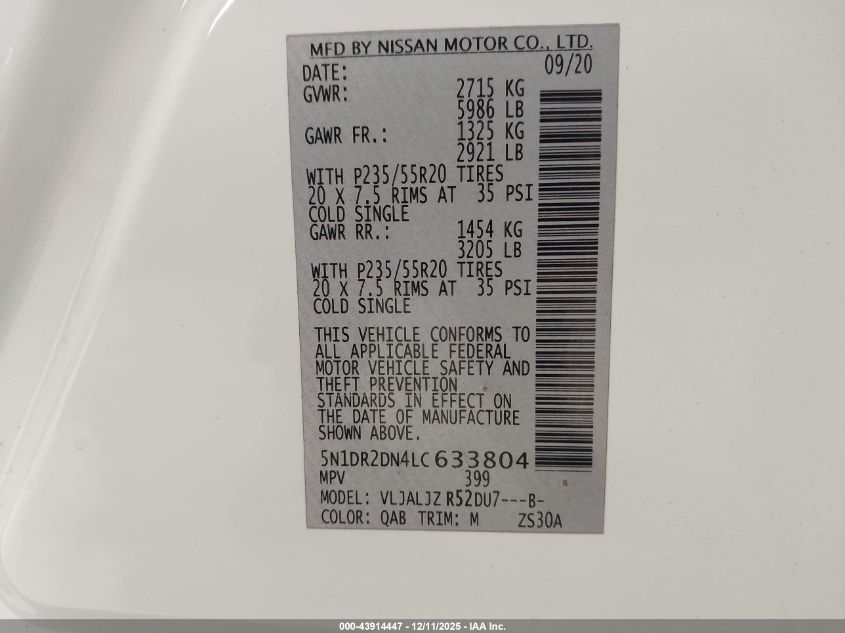 2020 NISSAN PATHFINDER 2020 року Бензин, 3.5, Передний привод, vin - 5N1DR2DN4LC633804 из США
