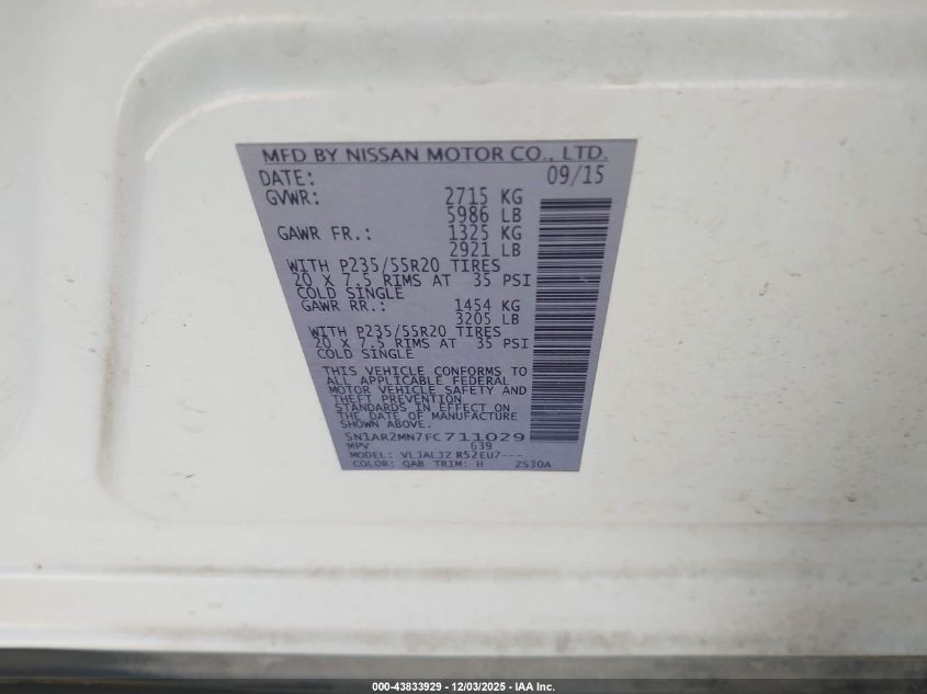 2015 NISSAN PATHFINDER 2015 року Бензин, 3.5, Передний привод, vin - 5N1AR2MN7FC711029 из США