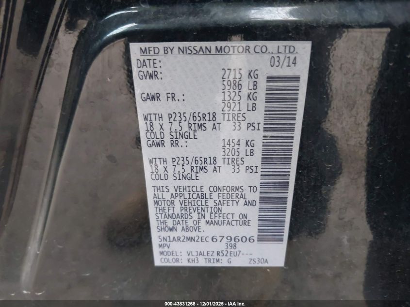 2014 NISSAN PATHFINDER 2014 року Бензин, 3.5, Передний привод, vin - 5N1AR2MN2EC679606 из США