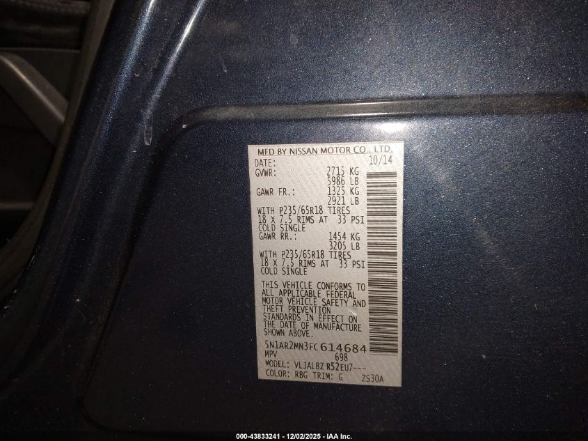 2015 NISSAN PATHFINDER 2015 року Бензин, 3.5, Передний привод, vin - 5N1AR2MN3FC614684 из США