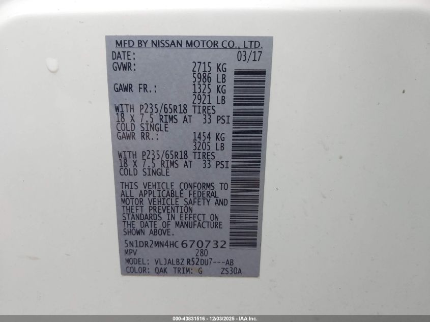 2017 NISSAN PATHFINDER 2017 року Бензин, 3.5, Передний привод, vin - 5N1DR2MN4HC670732 из США