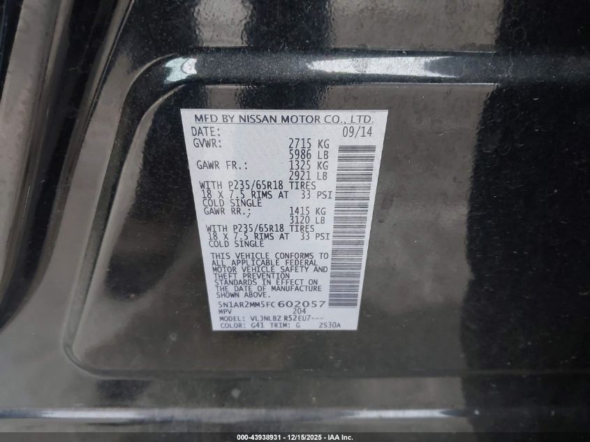2015 NISSAN PATHFINDER 2015 року Бензин, 3.5, Полный привод, vin - 5N1AR2MM5FC602057 из США