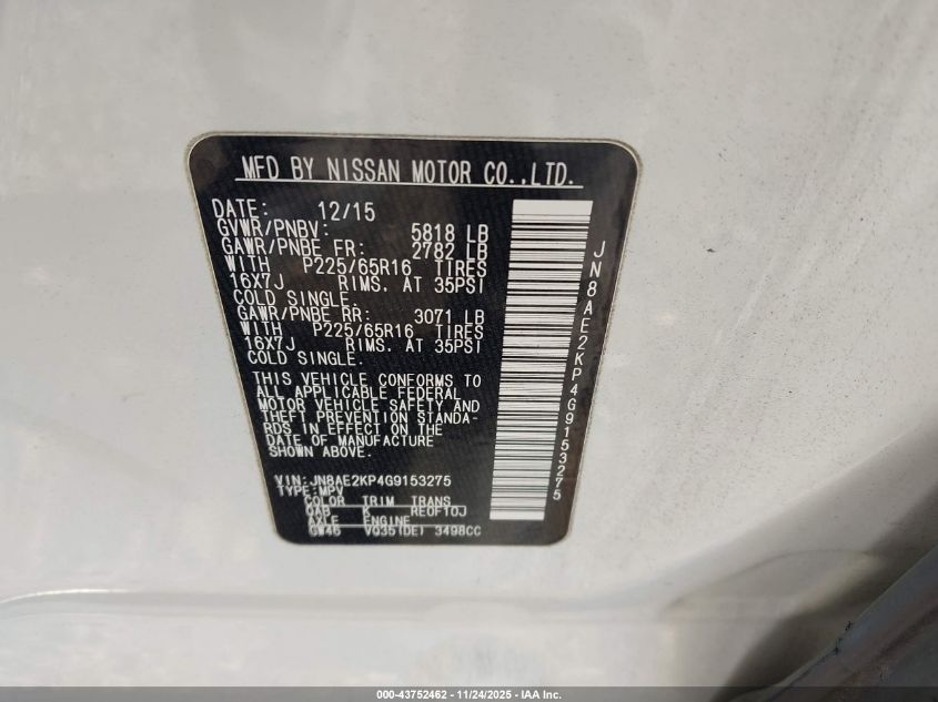 Цвет БелыйЦилиндры 6Привод Передний приводVIN JN8AE2KP4G9153275Состояние Заводится и едет (проверено)Повреждения По всему авто AutoRIA